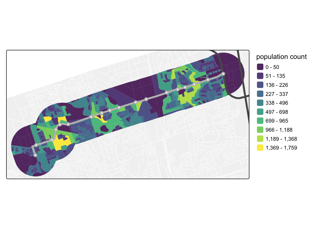 )OK, let’s see what we are working with by making a map of population counts around the Finch West LRT: