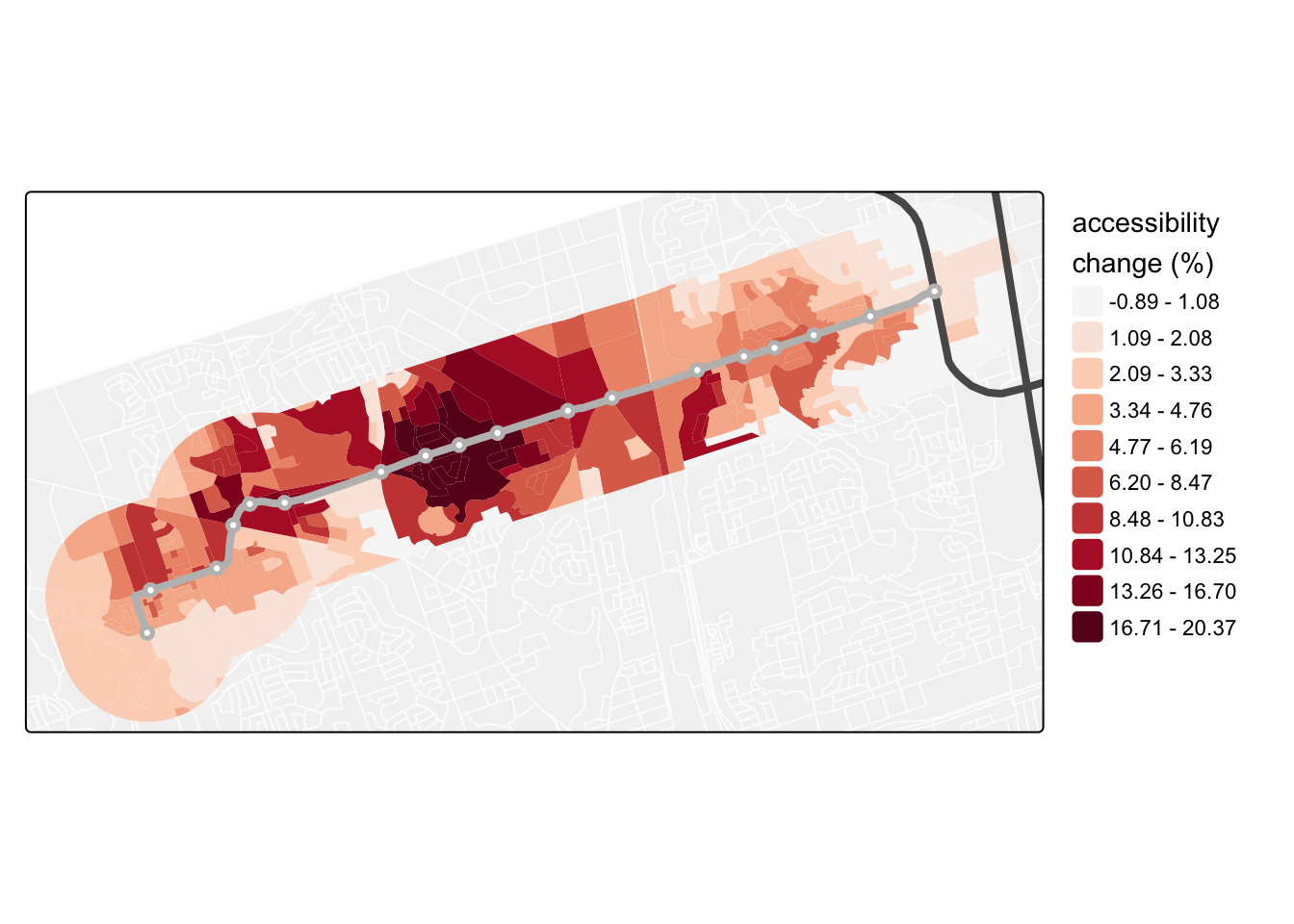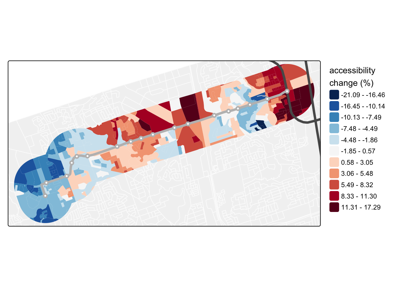 Interesting! The results in Figure 3 show quite a few DBs gained in access by up to about 17% with the LRT relative to the network in late 2018. However, quite a few DBs also lose access with the percentage change reaching up to about -21%. This is obviously not a great result – the addition of “rapid transit” along the corridor, ostensibly to replace a bus that is often bogged down in traffic, does not stand out as an accessibility “home run” with strictly positive gains in this analysis.