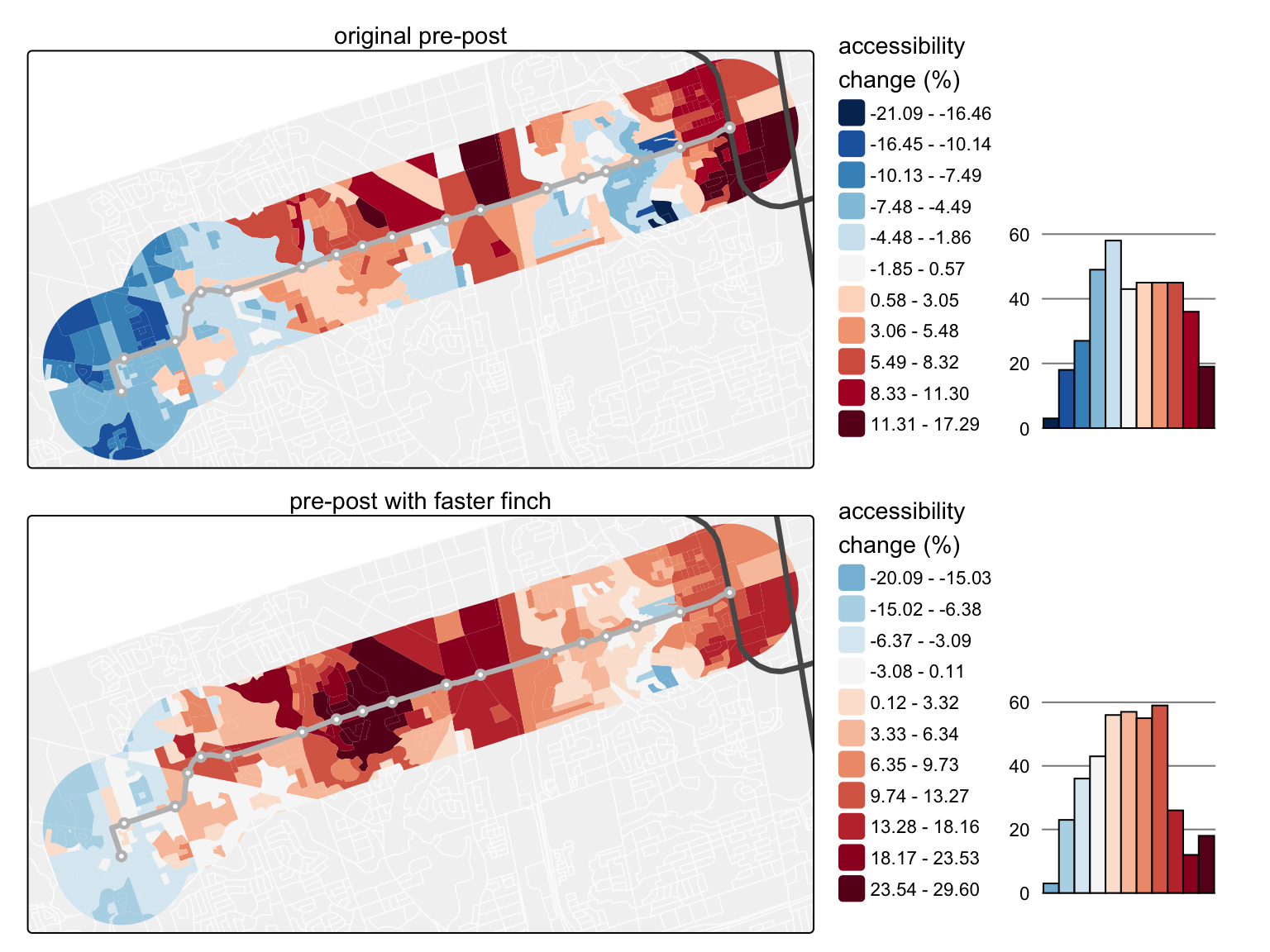 What about changes in accessibility? Let’s re-run the post-scenario accessibility analysis using the faster Finch network: